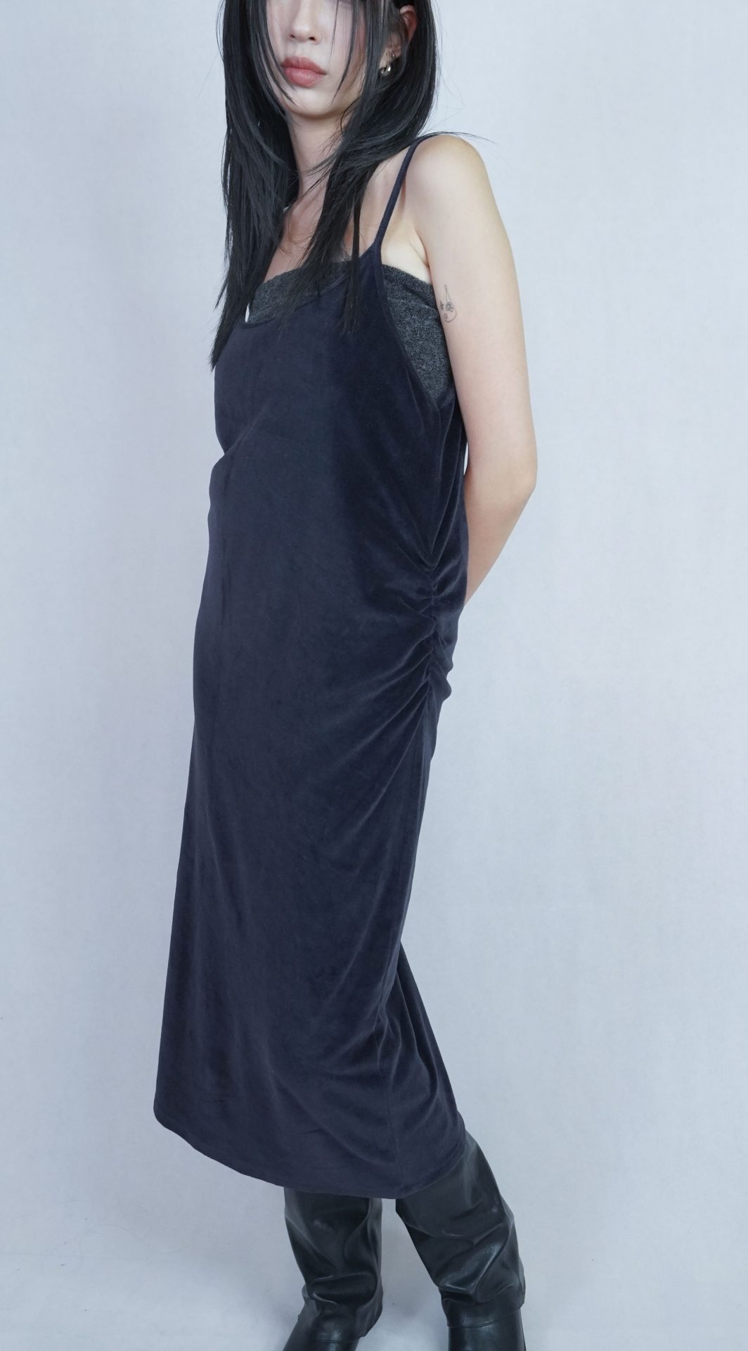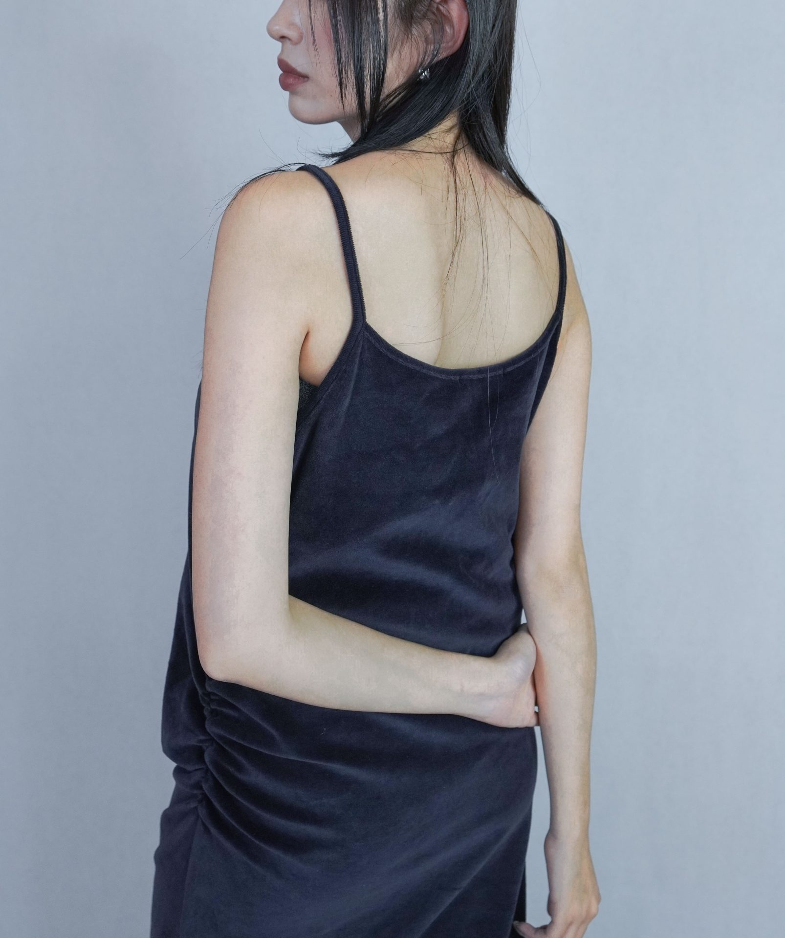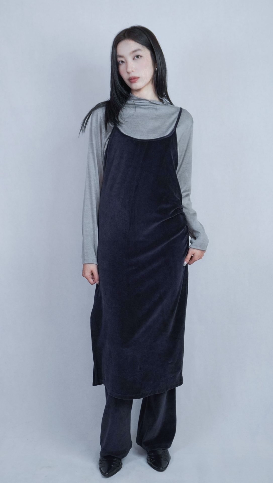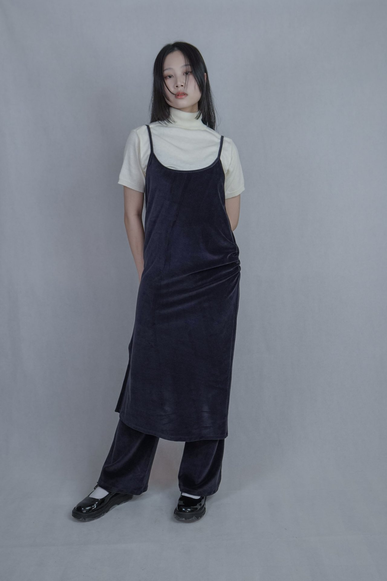– 側邊縮褶呈現設計版型,蜜桃絨質料舒適質感 搭配絨布喇叭褲成套俐落,內著內搭及單穿簡約時髦 – 供貨狀況: 現貨
