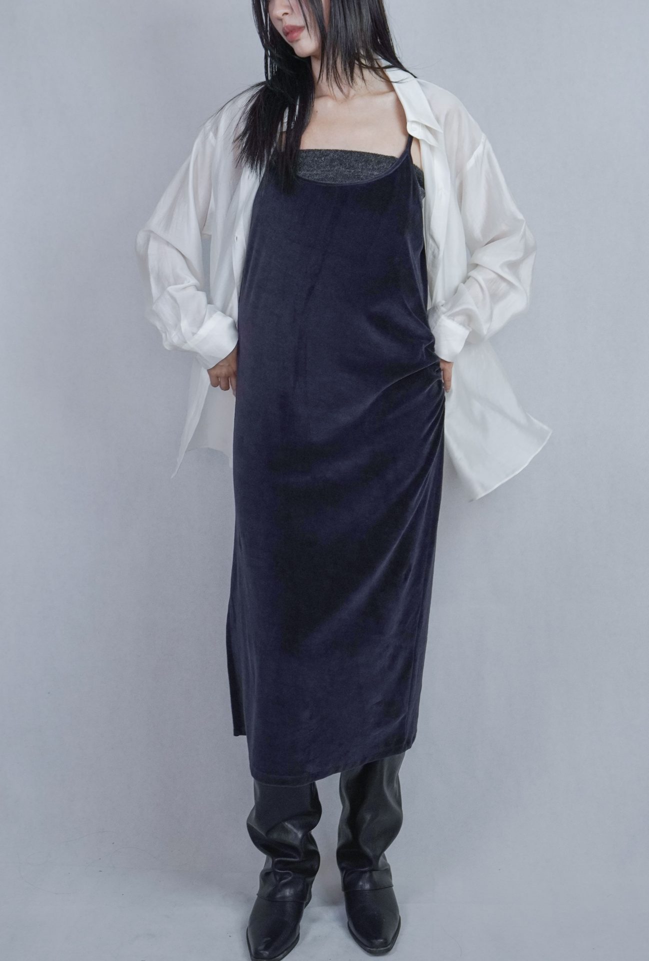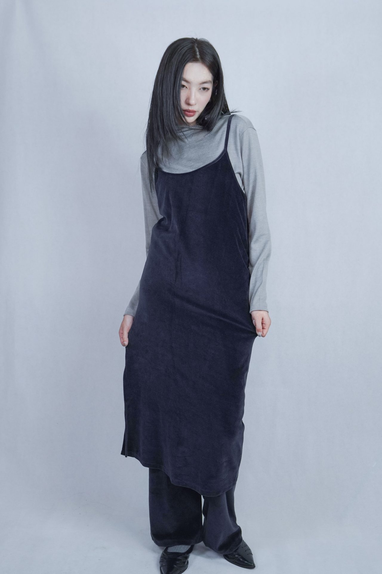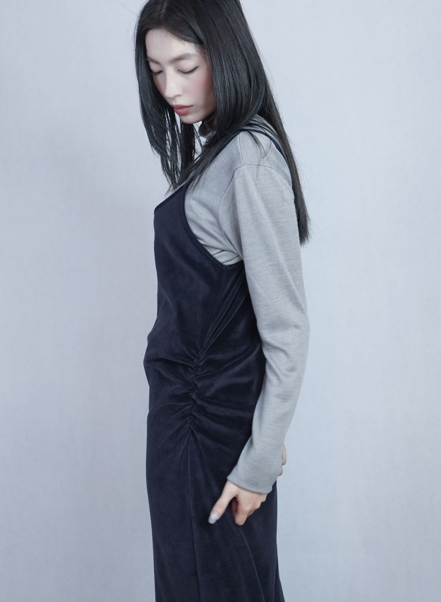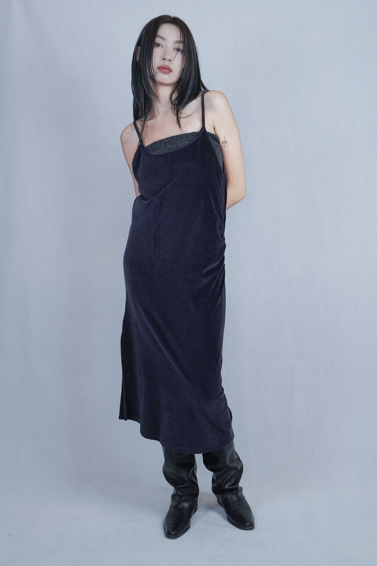 – 側邊縮褶呈現設計版型,蜜桃絨質料舒適質感 搭配絨布喇叭褲成套俐落,內著內搭及單穿簡約時髦 – 供貨狀況: 現貨