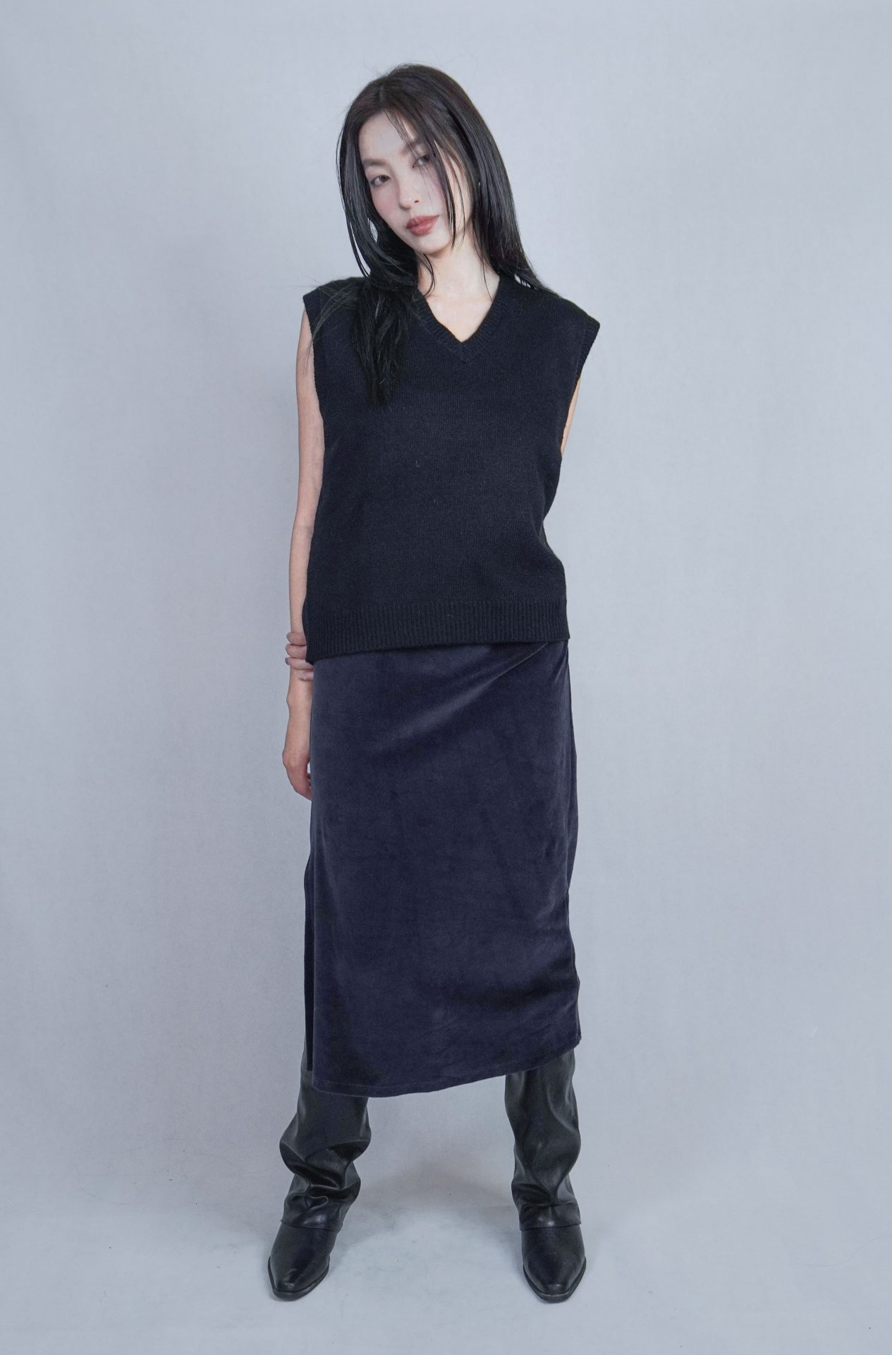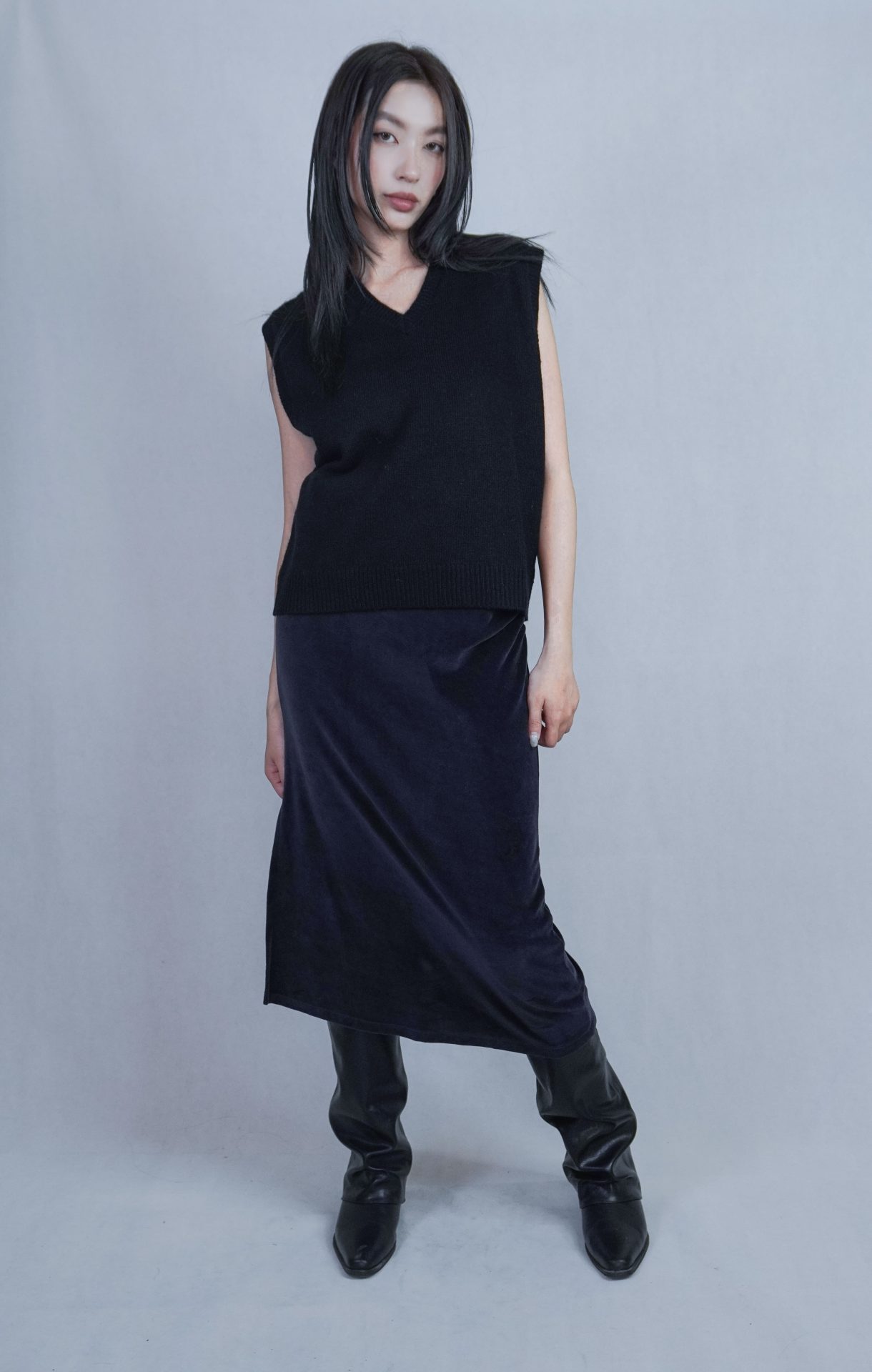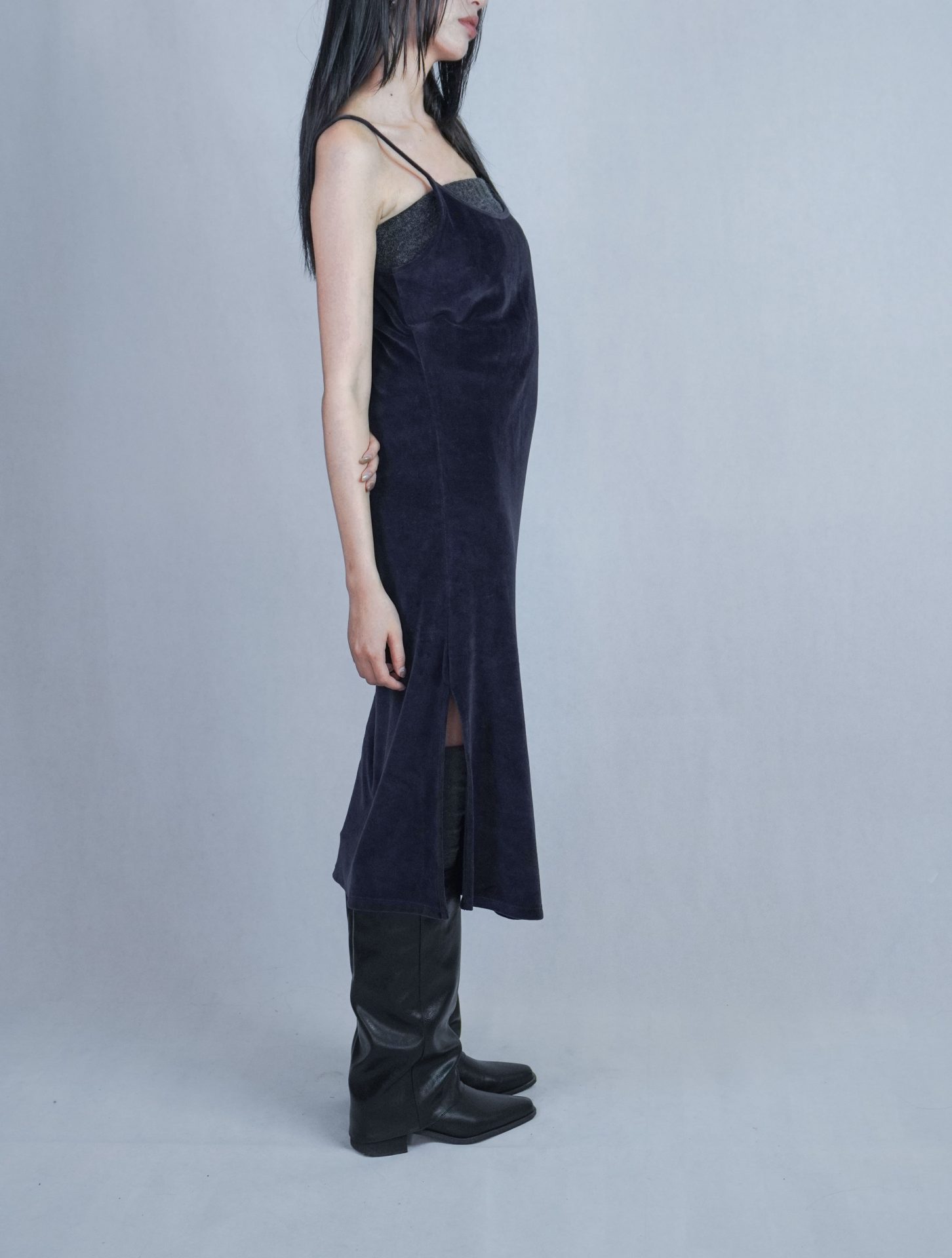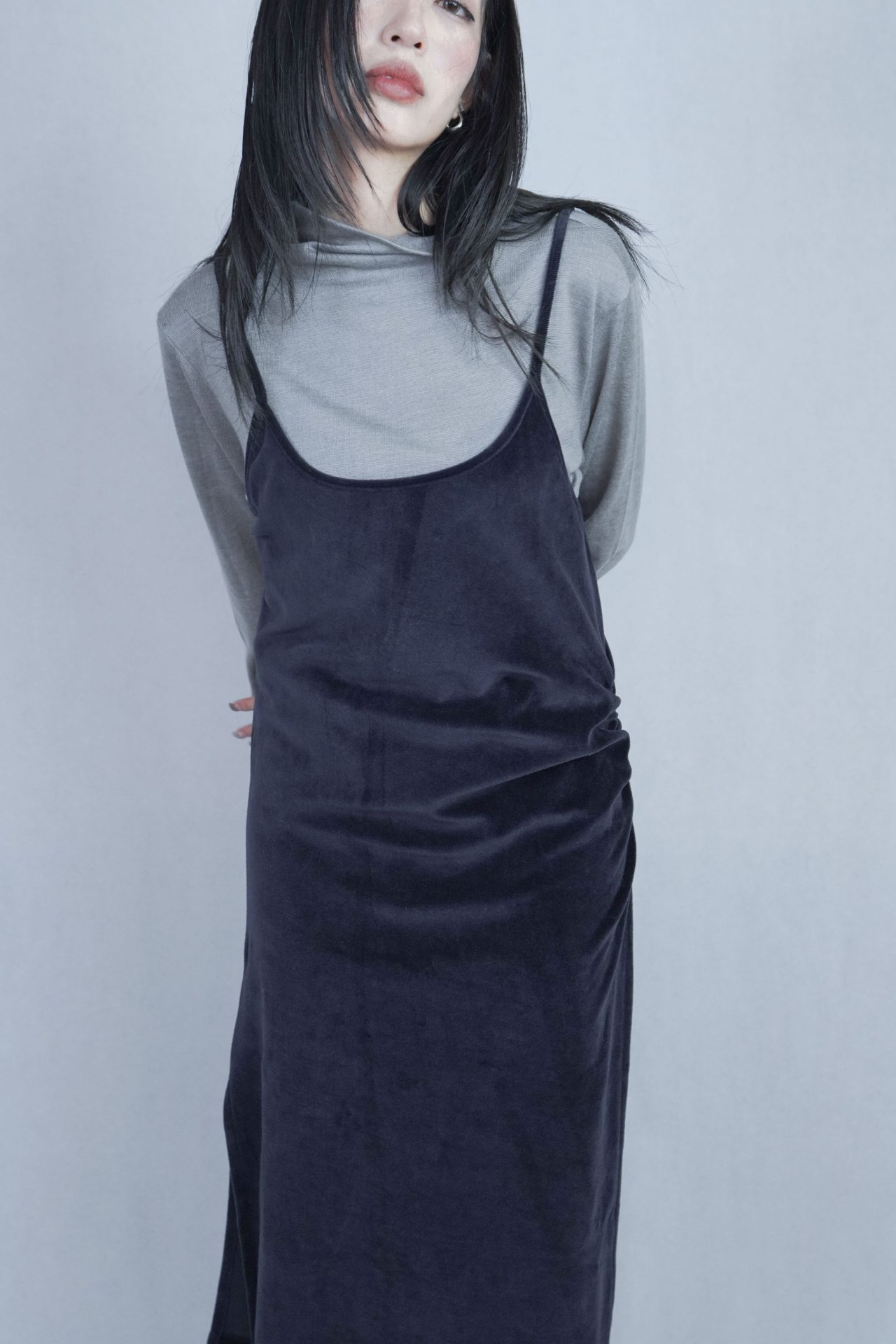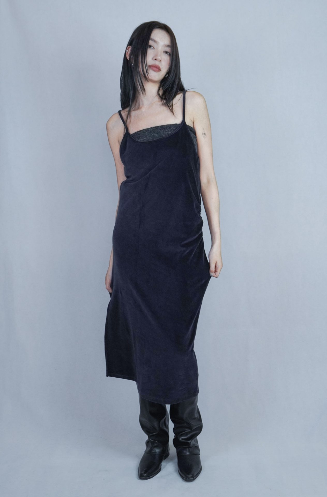 – 側邊縮褶呈現設計版型,蜜桃絨質料舒適質感 搭配絨布喇叭褲成套俐落,內著內搭及單穿簡約時髦 – 供貨狀況: 現貨