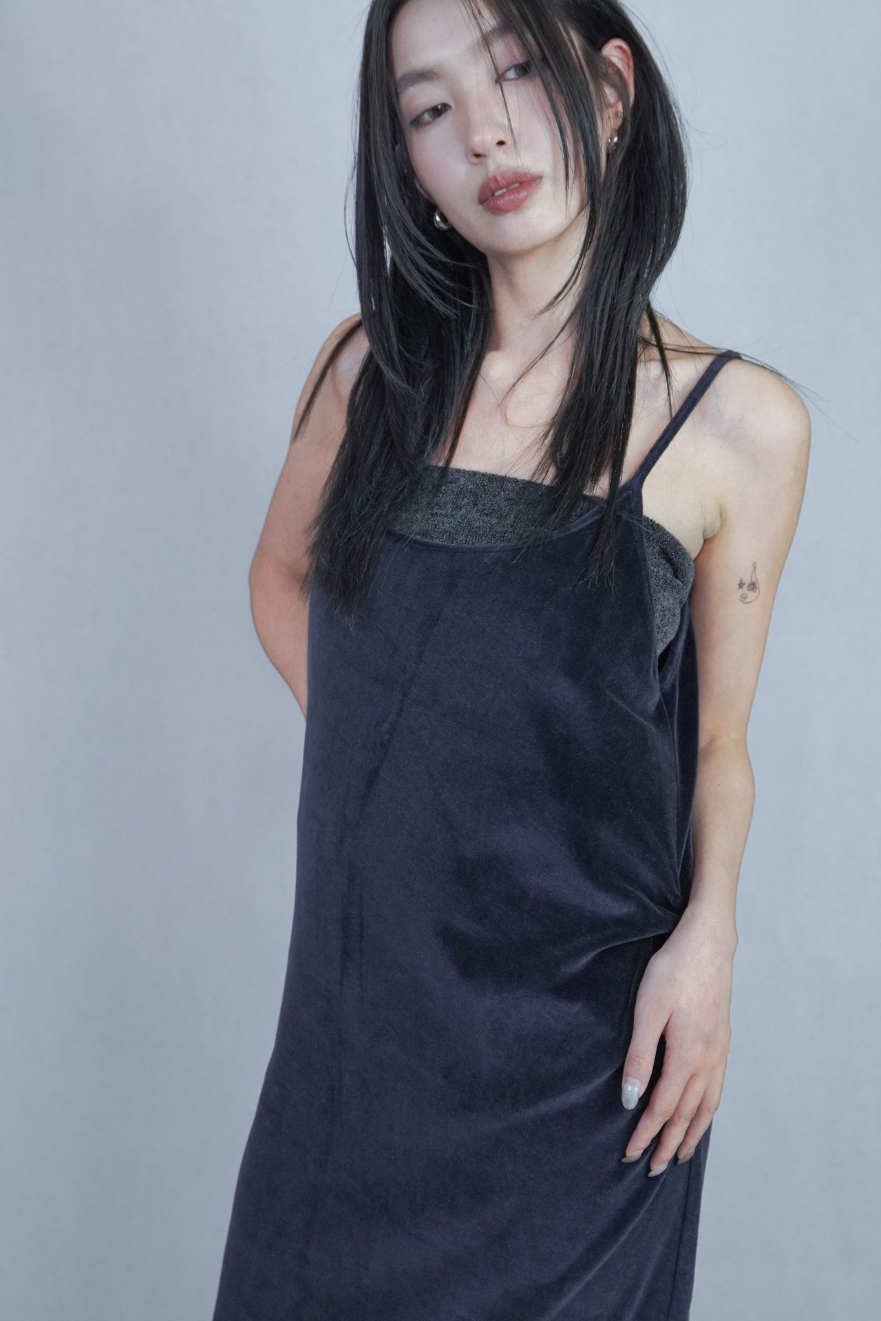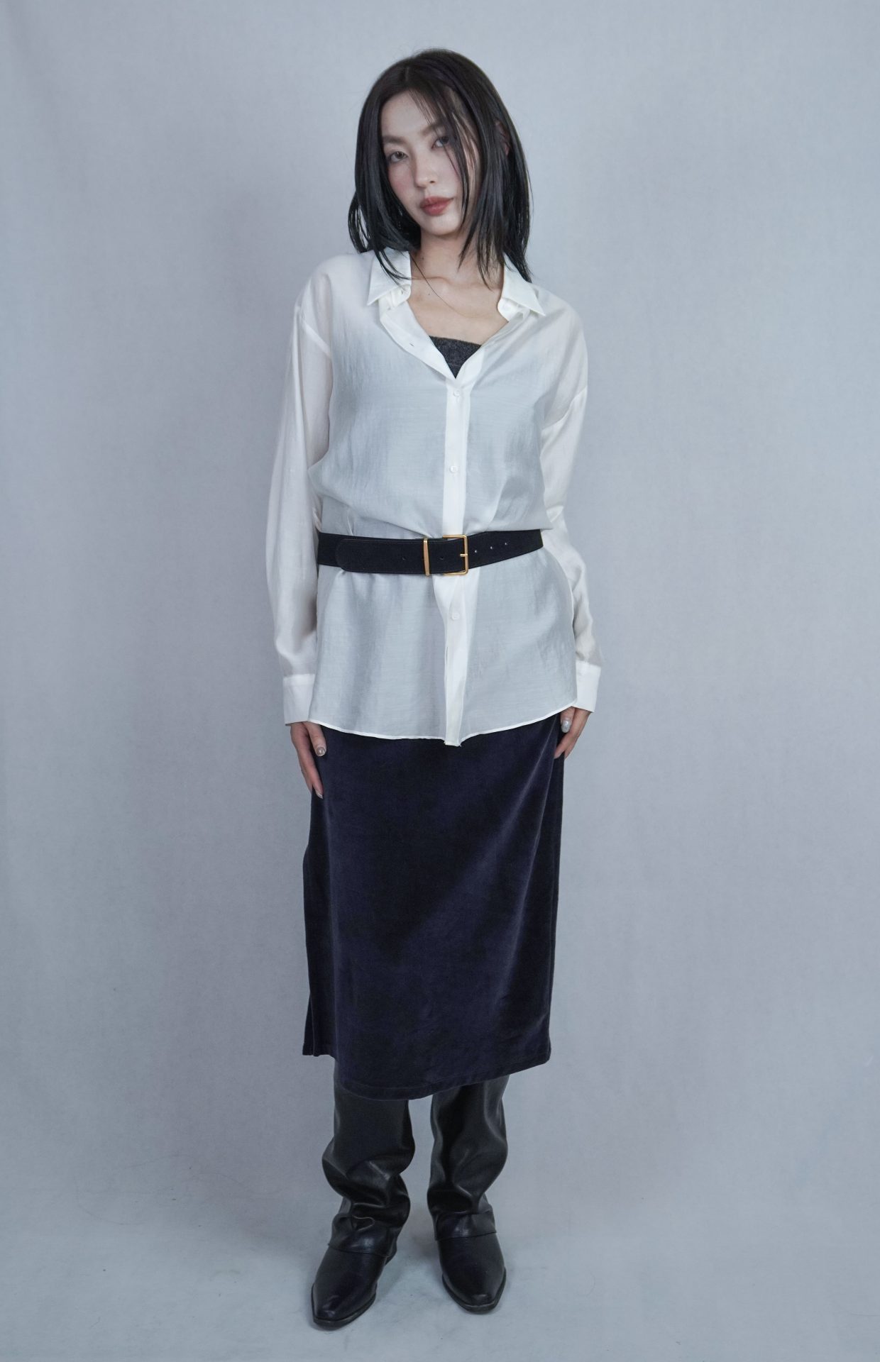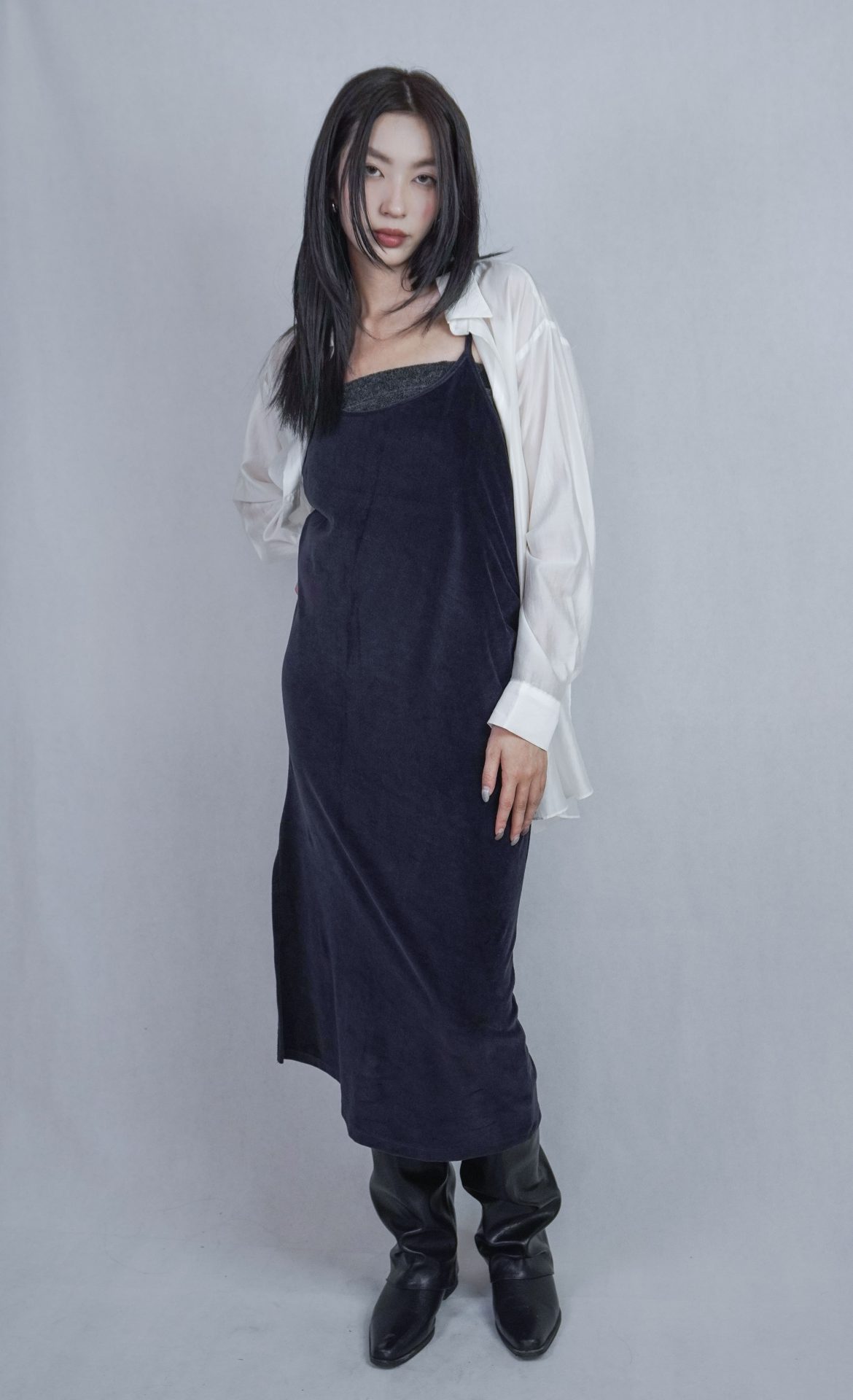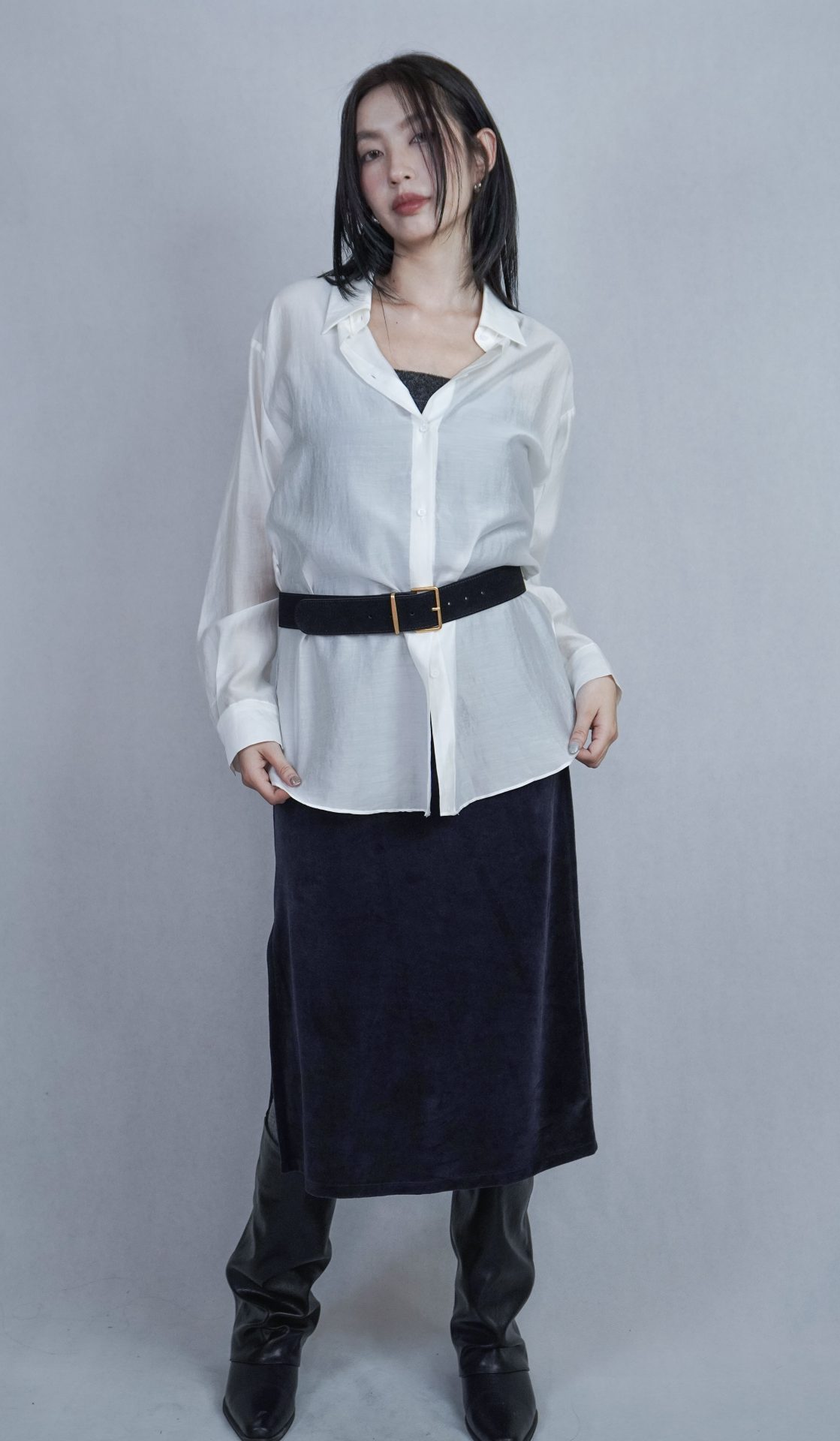 – 側邊縮褶呈現設計版型,蜜桃絨質料舒適質感 搭配絨布喇叭褲成套俐落,內著內搭及單穿簡約時髦 – 供貨狀況: 現貨